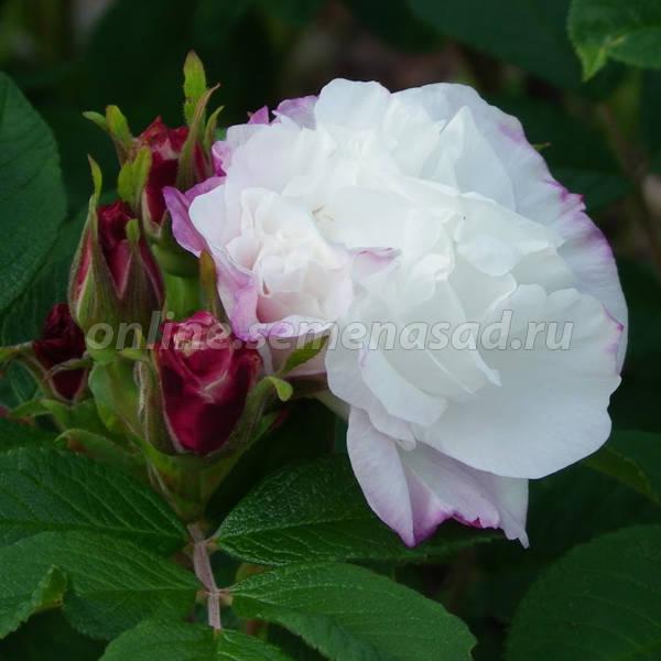 Белые, с легкой зеленцой, умеренно-махровые, чашевидные цветки появляются в небольших соцветиях из вишневых бутонов. Куст с ярко-зеленой, кожистой листвой, почти без шипов.