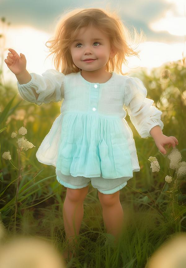 Самый легкий комплект из муслина на лето для детишек до 3-х лет. - Воздушный муслин (100% хлопок) - мягкий, нежный, хорошо пропускает воздух - Свободный крой - не будет натирать и доставлять дискомфорт ребенку - В самую жаркую погоду кожа малыша будет свободно дышать. А если крошка все же вспотеет, то лишняя влага быстро впитается. - Благодаря длинным рукавам кофты, малышка будет защищена от прямых солнечных лучей - В комплект входит платье и шортики