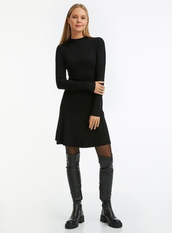 Вязаное платье прилегающего кроя длиной выше колена. Модель изготовлена из приятной к телу вискозной пряжи, имеет небольшой воротник-стойку и клешение от бедра.