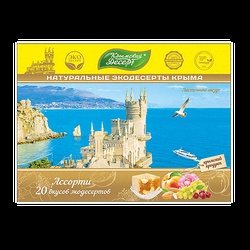 Состав: вода, сахар, патока, крахмал кукурузный, вишневое пюре, персиковое пюре, яблочное пюре, лимон, курага, апельсин, изюм, клюква, инжир, грейпфрут, гранат, миндаль, кешью, арахис, семечка подсолнечника, фундук, экстракт сосновых почек, виноградный сок, крахмал гороховый, кунжут, мак, кукурузная мука, молочная сыворотка, рисовые шарики, цикорий (пребиотик-инулин), морковь, гибискус, колючелистник, кокос, лепестки роз, лаванда, агар-агар, пектин, имбирь, куркума, гвоздика, кардамон, корица, ваниль, апельсиновое масло, эфирное масло мяты. Пищевая ценность на 100 г.: Белки Углеводы Жиры Пищевые волокна Калорийность 3 г 61 г 7 г 4 г 304 ккал