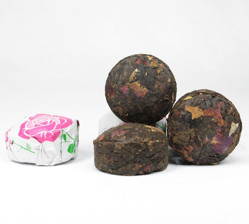 Лепестки розы запрессованные с листьями пуэра в форме чаши. Роза делает пуэр мягче и придает ему еле заметные оттенки розового масла в послевкусии. Заваривать при температуре 95°С.