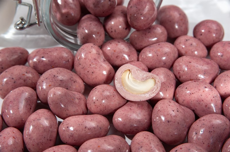Вес: 200 гр. Состав: белая шоколадная глазурь со вкусом йогурта (сахар, эквивалент масла какао, сухое обезжиренное молоко, сухое цельное молоко, сухая молочная сыворотка, эмульгаторы (Е322,Е476), ароматизатор "Йогурт"), ядро кешью жареное, сублимированный порошок черники, ароматизатор натуральный - Черника, глянец - комплексная пищевая добавка “Капол”