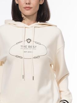 Тонкий неопрен с модифицированной вискозой и хлопком прочный, гибкий и тактильно приятный. Стильный свитшот-худи в таком качестве невероятно комфортен. Модель выполнена с несъемным капюшоном, втачным рукавом со спущенным плечом, длиной до середины бедра. На случай непогоды, капюшон с возможностью фиксации шнуром с лаконичными эглетами. Наша Компания полностью использует возможности собственного производства - манжеты модели связаны из пряжи на основе вискозы на японской плосковязальной машине Shima Seiki. Бренд Elis выступает за ценность принятия себя, поэтому изделие декорировано дизайнерским принтом "лучшая версия тебя", также выполненным на собственном производстве. Выражая любовь и уважение к себе каждый день, женщина Elis выбирает понятные и четкие образы, дающие уверенность. Сливочный оттенок свитшота особенно хорошо раскрывается в сочетании с черным, именно поэтому дизайнеры создали брюки PT0039K, комплементарные худи.