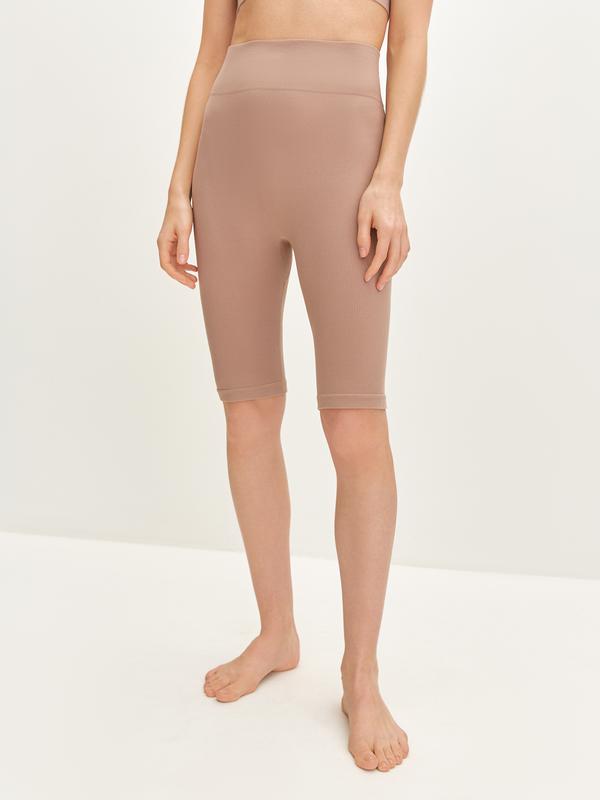 Спортивные шорты нейтрального бежевого оттенка из эластичного трикотажа. Материал отлично утягивает, не ограничивая свободу движения, а бесшовная техника формирует ровный обтекаемый силуэт. Модель прилегающего кроя с широким моделирующим поясом обеспечивает комфортную посадку по фигуре и отлично дополнит спортивный образ для пробежки или занятий йогой. Рекомендуется комбинировать с футболками и топами из нашей коллекции.