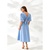 Платье женское из плательной ткани с высоким содержанием хлопка, приталенное, длиной до середины голени, расклешенное книзу. Перед отрезной по линии талии, со средним швом в верхней части и сборкой по среднему шву на уровне груди. Низ переда цельный. Спинка отрезная по талии, частично открытая в верхней части, с завязками бантом. Нижняя часть спинки цельная. Рукав втачной одношовный короткий широкий, на хлопковой подкладке, со сборкой по окату и эффектом "балон" внизу. Вырез горловины V-образный и по переду и по спинке, обработан обтачкой.