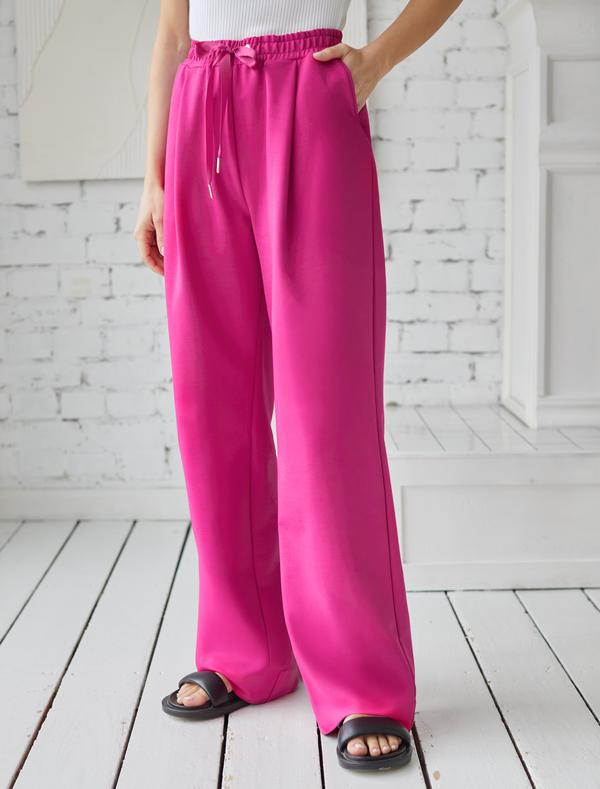 Брюки свободного кроя выполнены из эластичного футера-двухнитки. Модель дополнена защипами и боковыми карманами как у классических брюк и одним задним карманом. Эластичный пояс на резинке с шнурком из репсовой ленты и металлической фурнитурой. Брюки сочетаются в костюме с футболкой D49.085