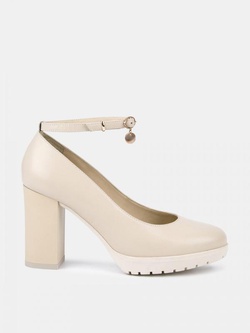 Туфли женские DORIS светло-бежевого цвета на высоком устойчивом каблуке. Натуральная кожа верха, подкладки и стельки позволяет ногам дышать и поддерживает правильный микроклимат в обуви. Светлая подкладка не будет окрашивать стопы. Съемный ремешок на щиколотке адаптирует модель к ногам разной полноты, он украшен небольшой подвеской-шармом. Каблук 9 см устойчив за счет своей толщины, прочная подошва из ТЭП частично компенсирует его высоту. Бежевые туфли дополнят классические деловые и более женственные образы с платьями и костюмами.