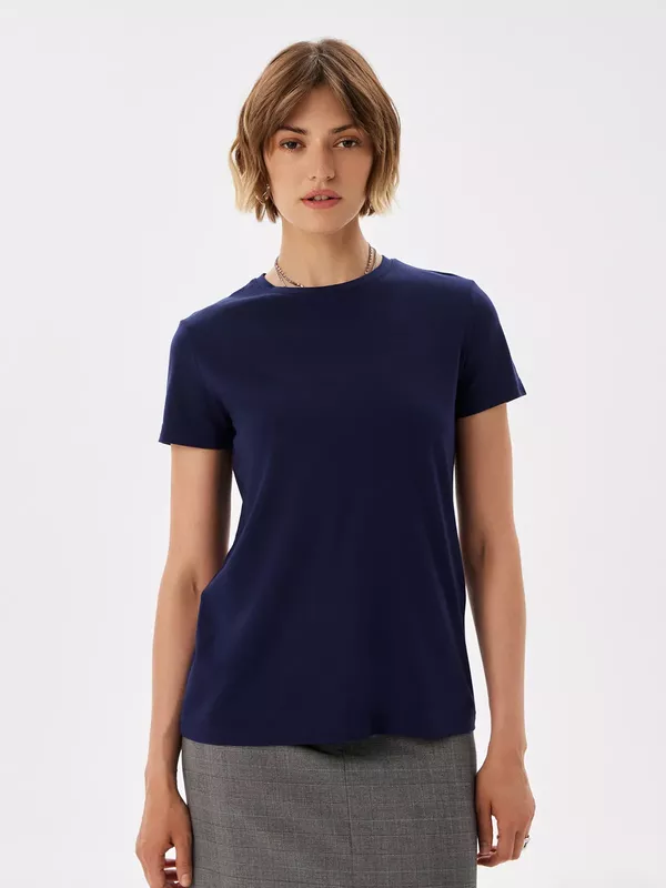 Тип Футболка женская кор.рукав. Артикул TL-TK-006RT-т.синий. Состав сырья 60%вискоза 31%нейлон 9%эластан. Бренд T-lab (Россия). Модель Полуприлегающая. Цвет Синий. Ворот Круглый. Карман отсутствует. Силуэт Полуприталенный силуэт / Regular fit