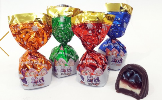 Конфеты куполообразной формы, с комбинированной начинкой, со вкусами черной смородины, клюквы, яблока, клубники, апельсина