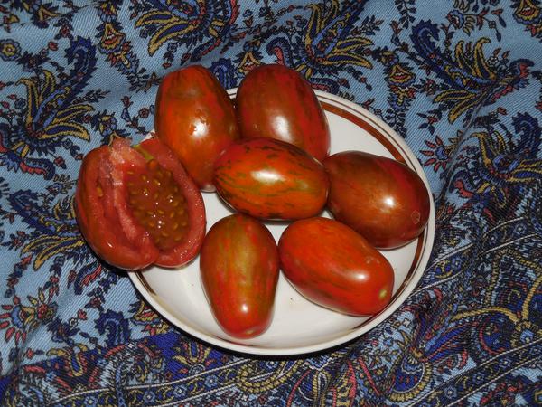 Томат "Суперэкзотик"- Украина. Индетерминантный, высокорослый среднеспелый сорт для теплиц и открытого грунта. Плоды сливовидные, шоколадного цвета с тёмно - зелёными полосами, средней массой 100-120 грамм. Сорт очень экзотический- идеален для цельноплодного консервирования.