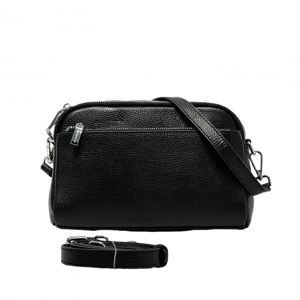 Вместительная кросс-боди MIRONPAN выполнена из натуральной зернистой кожи в черном оттенке. В сумке 2 отделения, каждое из которых закрывается на полукруглую молнию. Внутри одного отделения есть боковой карман для мелочей на молнии, внутри другого - открытый карман. На лицевой и тыльной стороне есть карман быстрого доступа на молнии. В комплекте два плечевых ремня шириной 2 см , один регулируется по длине. Цвет фурнитуры - серебро. Вес 535 Размер : 24 х 16 х 7 ( длина х высота х ширина)