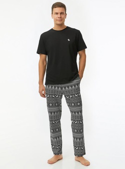 Уютная пижама из 100% хлопка. Комплект состоит из футболки с коротким рукавом и принтованных брюк на эластичном поясе. Брюки оформлены двумя косыми карманами для большего удобства. Футболка с коротким рукавом привлекает внимание миниатюрным изображением оленя, отображая атмосферу праздника. Брюки, украшенные зимними мотивами, создают тепло и уют.