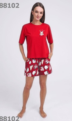 Описание: Пижама для дома из хлопкового трикотажного полотна. Футболка прямого силуэта, втачной короткий рукав,нашивка. Округлая горловина с обтачкой. Спереди принт. Шорты с поясом на резинке, боковые карманы с отрезным бочком. Состав: 100% хлопок
