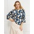 Разноцветная блуза с цельнокроеными широкими рукавами длины 3/4 сшита из шелковистого материала с абстрактным принтом. Овальная горловина, боковые разрезы.