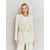 Молочный двубортный жакет свободного кроя с акцентированными плечами и остроконечными лацканами выполнен из плотной костюмной ткани, которая не мнется и надолго сохраняет опрятный внешний вид. Длинный пояс-лента, продернутый в шлевки, формирует мягкий приталенный силуэт. Для расслабленного образа завяжите пояс сзади и носите жакет расстегнутым поверх топа.
