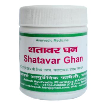 Благодаря наличию в составе препарата только чистого экстракта (выпаренный сок) шатавари, эффективность Шатавари Гхан Адарш Аюрведик на порядок выше обычной формы (порошка или таблеток). Благодаря этому лечение не растягивается на многие месяцы, а результат действия препарата заметен практически сразу. Состав: Asparagus racemosus. Показания: слабость женских половых органов, бесплодие, климактерический период, бели, понос, дизентерия, обезвоживание, язвенная болезнь желудка, повышенная кислотность, легочные абсцессы, кашель, герпес, рецидивирующие лихорадки, восстановительный период. Применение: по 1 таблетке 1-2 раза в день. Или по предписанию врача. Шатавари переводится как «имеющая сотню мужей» (ее тонизирующее и омолаживающее воздействие на женские половые органы, согласно поверьям, дает возможность иметь сто мужей). Asparagus racemosus является основным омолаживающим растением для женщин, таким же, как Ашваганда для мужчин (хотя оба препарата оказывают некоторое воздействие на оба пола). Шатавари является прекрасной расаяной для Пита-доши, для женской репродуктивной системы. Усиливает выработку грудного молока, нормализует месячный цикл, повышает способность яйцеклеток к оплодотворению, предотвращает развитие фибром и мастопатий. Шатавари оказывает прекрасное смягчающее действие на слизистые желудка, легких, почек и половых органов, эффективна при язве желудка. При бесплодии хорошо употреблять 1 ч.л. Шатавари с молоком и шафраном, поскольку она обладает прекрасным тонизирующим действием для матки и яичников. Отвар из Шатавари с топленым маслом в Аюрведе используют женщины для восстановления груди после родов. Облегчает жажду, способствует сохранению жидкостей в организме, показана при поносе, дизентерии. Наружно используется при тугоподвижности суставов, а также при мышечных спазмах. Успокаивает и смягчает Вата-доша.