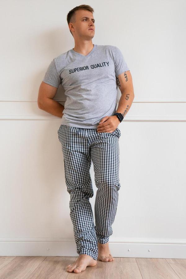 Домашний мужской костюм Майкл поможет расслабиться после тяжелого рабочего дня и насладиться домашним уютом. Домашняя мужская пижама в оттенках серого состоит из футболки с надписью на груди и брюк с привлекательной расцветкой в виде клетки создан из кулирки. Брюки на 100% состоят из хлопка, что позволяет им оставаться дышащими и легкими. Футболка на 50% состоит из хлопка и на 50% из полиэстера, что позволяет ей тянуться и не сминаться. Вы будете чувствовать себя уверенно, если внезапно придут гости или в дверь постучатся соседи. Будет незаменим в вашем гардеробе.<br><h3>Ткань</h3><p>кулирка, хлопок стрейч</p><h3>Состав</h3><p>Брюки: 100% хлопок; Футболка: 50% хлопок, 50% п/э</p>