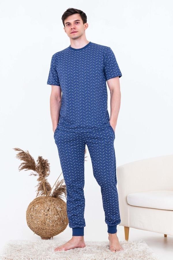 Костюм домашний из 100% хлопка. Очень уютный и удобный. Горловина и манжеты брюк выполнены из эластичной резинки-кашкорсе. Благодаря наличию лайкры в манжетах после стирки они не вытягиваются. Карманы в боковых швах брюк. Пояс на плотной резинке 2 см. Костюм можно с удовольствием носить на любимой даче.<br><h3>Ткань</h3><p>кулирка</p><h3>Состав</h3><p>индиго: 100% хлопок</p>