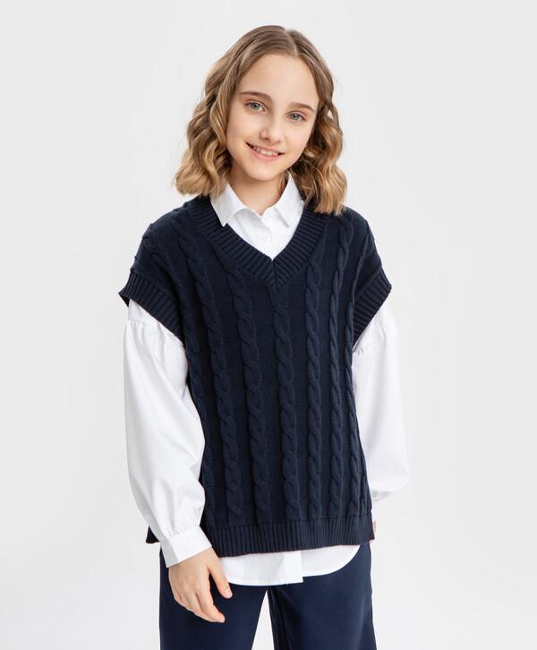 Жилет синий с вязаными косами для девочки от Button Blue. Изделие выполнено из хлопка. За счет этого оно очень мягкое и приятное на ощупь, дышащее и простое в уходе. Свободный крой дарит легкость движений без сковывания и позволяет надевать под жилет одежду любых объемов - от рубашек и блуз до пуловеров. Ребенку не будет в нем тесно еще и за счет боковых разрезов в нижней части. V-образный вырез горловины, обрамленный рубчиком, выигрышно подчеркнет шею. Низ жилета и рукава также выполнены в рубчик. Изделие однотонное, что позволяет составлять с ним множество стильных образов как для похода на учебу, так и для прогулок или посещения галереи. Оно отлично будет сочетаться со школьной формой любого оттенка. Модности образу добавляют ненавязчивые вязаные вертикальные косички спереди жилетки. Это база на все времена и под любой стиль. Следуйте рекомендациям по уходу, указанным на вшивной этикетке.