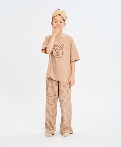 Брюки пижамные широкие для девочки коричневые с поясом на резинке и принтом