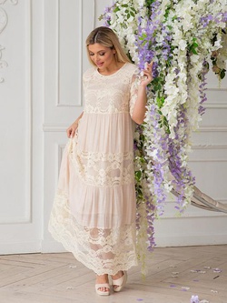 Нарядное многоярусное платье, свободного силуэта, выполнено из легкой плательной ткани «марлевка» в сочетании с кружевным полотном. Платье с отрезной слегка завышенной линией талии, верх переда целый, спинка со средним швом. Круглый вырез горловины переда и горловина спинки обработаны подкладом. Рукав втачной короткий. Длина рукава от плеча в 48 р-ре – 28 см. в 60 р-ре – 32 см., ширина рукава по низу в 48 р-ре – 36 см. в 60 р-ре – 44 см. Нижняя часть платья из четырех ярусов, каждый ярус со сборкой по шву притачивания. Платье без застежек, на подкладе, подклад выполнен из основной ткани. Длина изделия по спинке в 48 р-ре – 125 см. в 60 р-ре – 136 см.