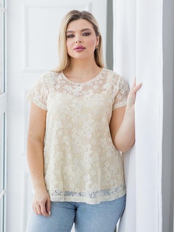 Удобная блузка свободного силуэта, выполнена из кружевного полотна. Перед блузки целый, спинка со средним швом, с разрезом в верхней части с застежкой на воздушную петлю и пуговицу. Горловина переда и спинки обработана настрочной окантовкой. Рукав втачной короткий. Длина рукава от плечевой точки в 48 р-ре – 14 см. в 60 р-ре – 16 см., ширина рукава в 48 р-ре – 38 см. в 60 р-ре – 48 см. Длина изделия по спинке в 48 р-ре – 62 см. в 60 р-ре – 68 см. Блузка в комплекте с топом на бретелях, длина бретелей не регулируется. Топ выполнен из тонкого хлопкового полотна. Длина топа без бретелей (с бретелей) в 48 р-ре – 48 см. (58 см.) в 60 р-ре – 51 см. (65 см.).
