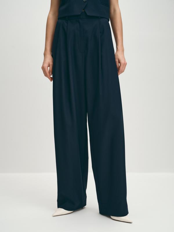 <ul><li>Бренд: Elis</li> <li>Период вывески: 15.08</li> <li>Капсула: NEW ROMANTICS 1</li> <li>Артикул: TR0475</li> <li>Ассортимент: Брюки женские</li> <li>Состав: Полиэстер - 69%, Вискоза - 29%, Эластан - 2%</li></ul><br/><br/><h2>Описание</h2> Длинные брюки палаццо с высокой посадкой. Модель с притачным поясом, косыми боковыми и декоративным задним карманом. Брюки выполнены со стрелками, образованными из складок. Такой крой возможен благодаря хорошей плотности костюмной вискозной ткани. Брюки в классическом синем подходят для офиса, школы, прогулки, праздника. Укороченный жилет с дизайнерским срезом борта завершит костюм.