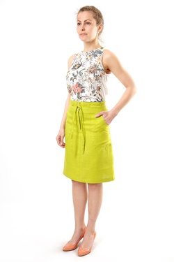 <p> Юбка льняная женская #012 "колокольчик" короткая, расширенная к низу, длиной выше уровня колен. Линия талии оформлена притачным поясом, с застежкой на петлю и пуговицу, с кулиской под шнурок, застежка – молния в среднем шве передней половинки. На передней половинке настрочены декоративные накладные карманы, отделочные строчки проложены по гульфику, среднему шву, накладным карманам, низу изделия. Юбка льняная женская #012 "колокольчик" короткая изготавливается из 100%-й льняной ткани.</p>