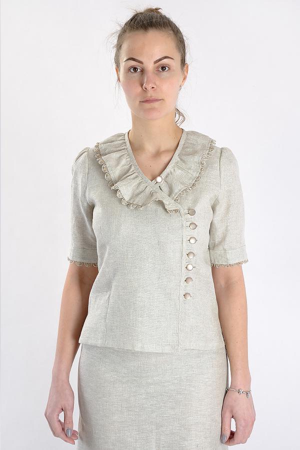 <p>Блузка женская из льна #012 изготавливается из 100%-й льняной ткани. Блузка имеет прилегающй силуэт, базовый покрой, выполнена со смещенной застежкой на навесные петли и пуговицы. Полочка блузки изготовлена с вертикальной нагрудной вытачкой, переходящей в талиевую. Спинка с талиевой вытачкой. Рукав втачной одношовный, длиной выше уровня локтя, со сборкой по окату.</p><p>Рукав выполнен на манжете с окантованным разрезом в локтевой части и застежкой на навесную петлю и пуговицу. Горловина изделия имеет V-образную форму с воланом. Горловина и край борта окантованы. Низ рукава, волан горловина обработаны тесьмой .</p>