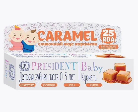 PRESIDENT Baby карамель детская зубная паста от 0 до 3, с появления первого зубика. Показатель абразивности: 25 RDA. Безопасно и эффективно удаляет налет благодаря сферолитам SYLOBLANC. Обеспечивает деликатный уход за нежными деснами малыша и молочными зубами. Сливочный карамельный вкус позволяет приучить ребенка к ежедневной гигиене полости рта и превращает чистку зубов в удовольствие. Активные компоненты: Эстракт липы Экстракт ромашки Вкус карамели Биодоступный кальций