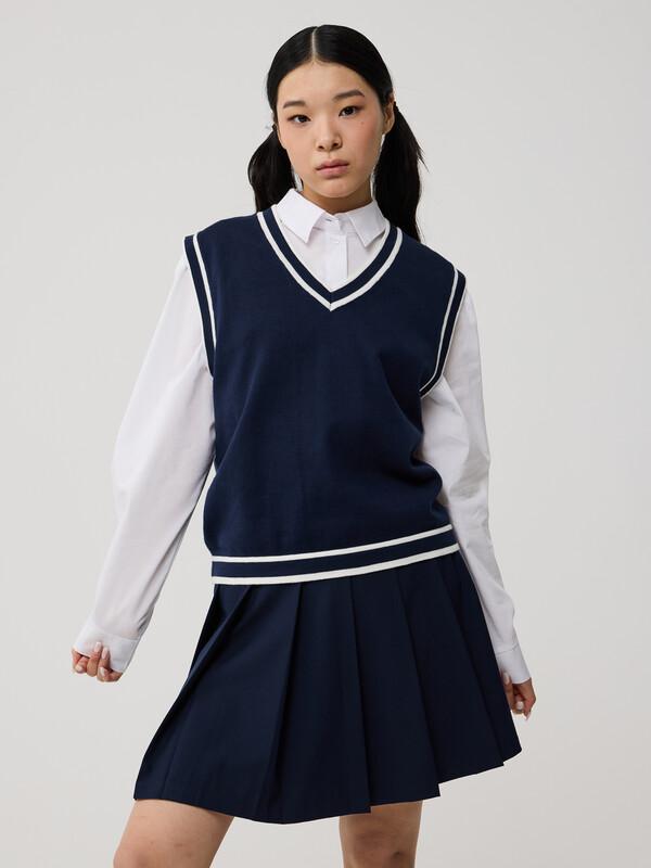 Стильный, слегка укороченный вязанный жилет с V-образным вырезом из хлопковой пряжи прямого фасона. Низ жилета, пройма рукавов и вырез горловины оформлены фактурной резинкой, вдоль горловины резинка контрастного цвета. Жилет выполнен из 100% хлопка, что обеспечивает отличную воздухопроницаемость и комфорт в повседневной носке.