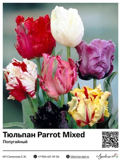 <ul><li>Высота растения: 30-60 см</li> <li>Диаметр цветка/соцветия: 5-15 см</li> <li>Цвет: Разноцветный</li> <li>Группа растения: Тюльпаны попугайные (Tulips Parrot)</li> <li>Категория: Тюльпаны (Луковицы)</li> <li>Размер посадочного материала: 11/12</li> <li>Количество в упаковке: 5 шт</li> <li>Страна происхождения: Голландия</li> <li>Глубина посадки: 10-15 см</li> <li>Расстояние посадки: 10-20 см</li> <li>Требования к свету (световой режим): Солнце</li> <li>Цвет листьев: Зеленые</li> <li>Влажность почвы: Умеренно влажная</li> <li>Условия полива: Умеренный</li> <li>Зона морозостойкости: Зона 3-4</li> <li>Подходит на срезку: Да</li> <li>Период цветения старт: Апрель</li> <li>Период цветения конец: Май</li></ul><br/><br/>68 ₽ за шт / в уп. 5 шт