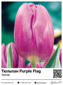 <ul><li>Высота растения: 40-50 см</li> <li>Диаметр цветка/соцветия: 5-10 см</li> <li>Цвет: Пурпурный</li> <li>Группа растения: Тюльпаны Триумф (Tulips Triumph)</li> <li>Категория: Тюльпаны (Луковицы)</li> <li>Размер посадочного материала: 11/12</li> <li>Количество в упаковке: 5 шт</li> <li>Страна происхождения: Голландия</li> <li>Глубина посадки: 10-15 см</li> <li>Расстояние посадки: 10-20 см</li> <li>Требования к свету (световой режим): Солнце</li> <li>Цвет листьев: Зеленые</li> <li>Влажность почвы: Умеренно влажная</li> <li>Условия полива: Умеренный</li> <li>Зона морозостойкости: Зона 3-4</li> <li>Подходит на срезку: Да</li> <li>Период цветения старт: Апрель</li> <li>Период цветения конец: Май</li></ul><br/><br/>50 ₽ за шт / в уп. 5 шт