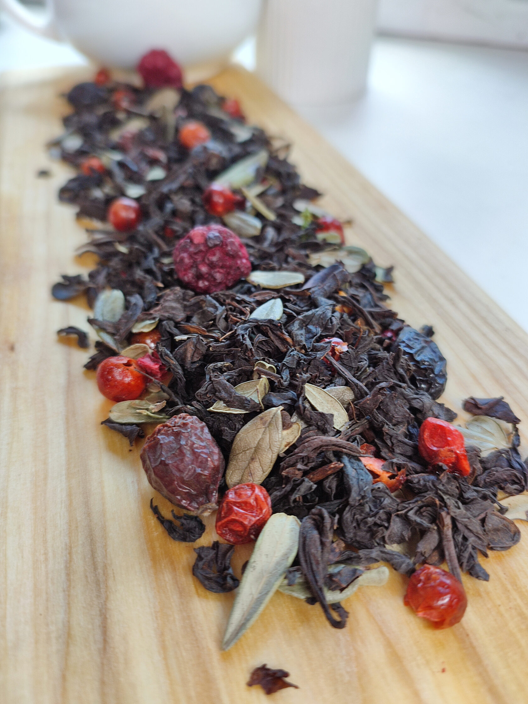 Черный крупнолистовой чай с сушеным шиповником, листом брусники, сублимированными ягодами калины и ежевики. Без подсластителей и ароматизаторов.