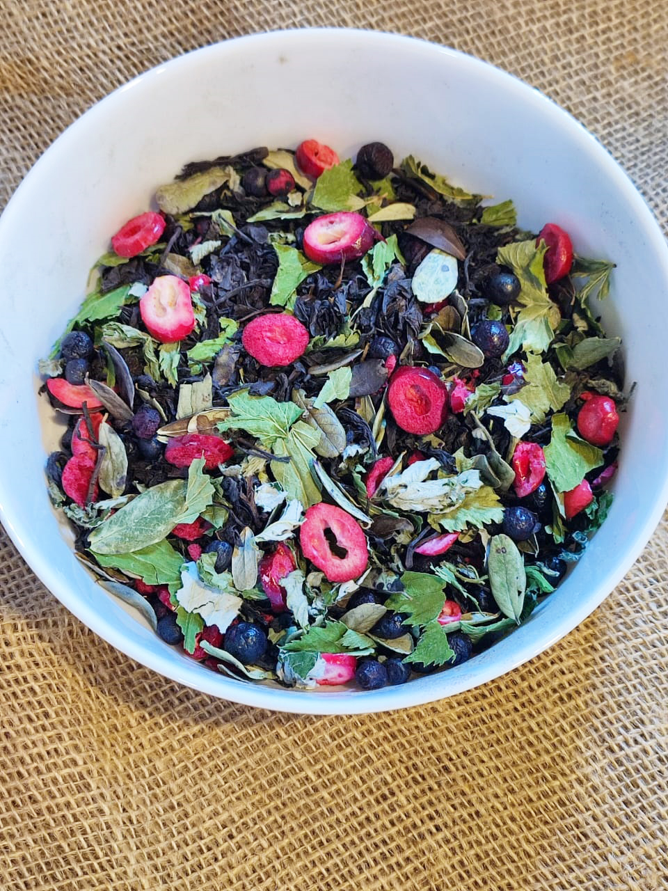 Черный чай с добавлением листа брусники, малины и смородины, сублимированных ягод черники и слайсов клюквы.
