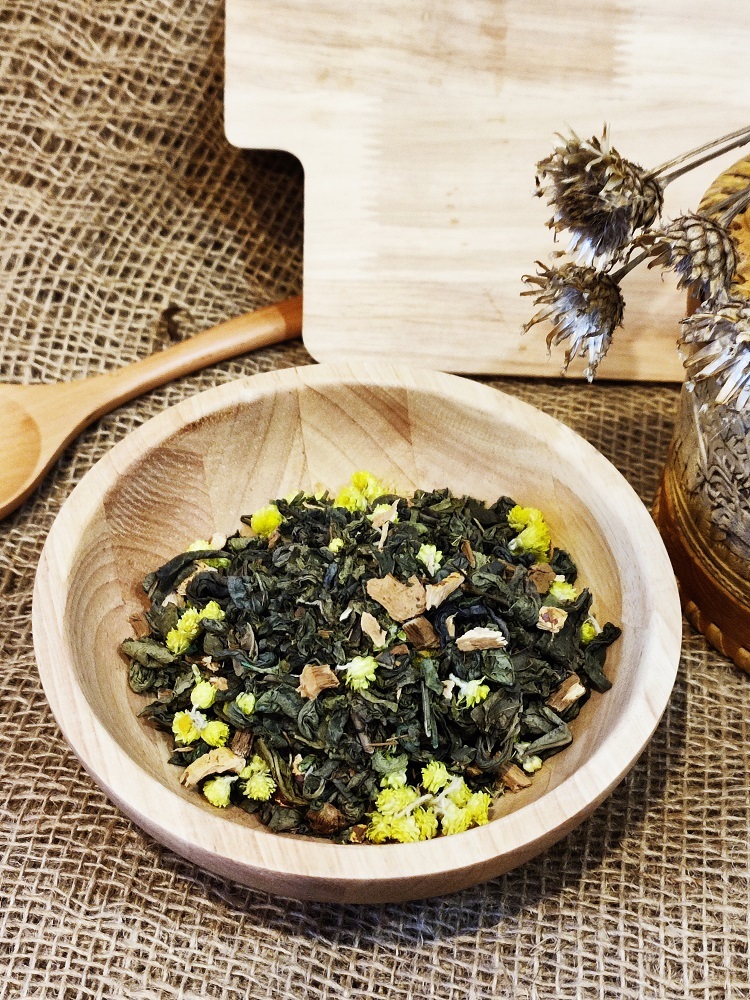 Зеленый чай с добавлением ароматного саган-дайля, кусочками гриба рейши (гриб долголетия) и цветами бессмертника.