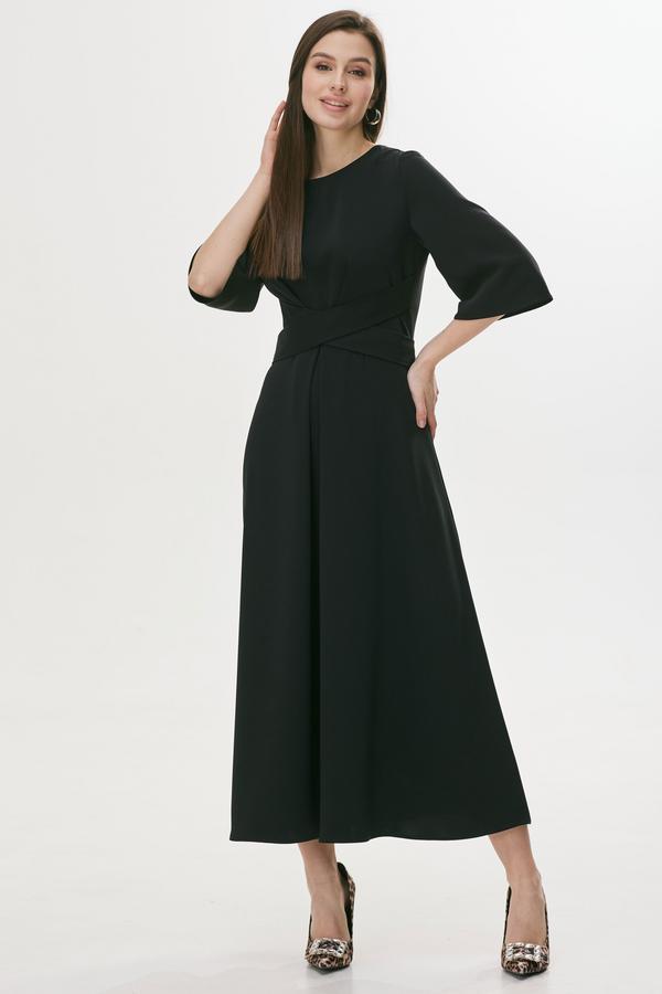 Платье полуприлигающего силуэта расширенного к низу из струящейся ткани. Горловина округлая. Рукав втачной расширенный по низу. Платье отрезное по линии талии. По переду в области талии встречные складки. Декоративным элементом в платье служит длинный пояс. В среднем шве на спинке потайная молния и таливые выточки.