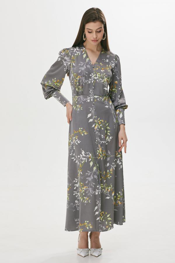Стильное платье полуприлегающего силуэта расширенное книзу из струящейся ткани. Горловина V-образная. Платье отрезное выше лини талии. По переду шов с разрезом и декоративными пуговицами. По переду в области груди и на спинке сборка. Рукав втачной длинный, по низу манжета с застежкой на петли у пуговицы. Обращаем ваше внимание, что фурнитура может незначительно отличаться от фото.