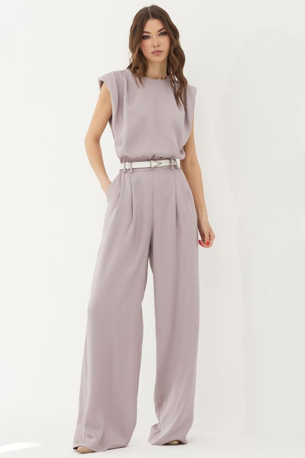 Стильный комбинезон полуприлегающего силуэта с расширенными книзу брюками из вискозной ткани. Горловина округлая. Брюки прямого силуэта со складками по переду и наклонными карманами. Лиф прямого кроя со сборкой по низу. По переду и спинке складки выходящие из плечевого шва. Плечо расширено, предусмотрены плечевые накладки. Лиф соединен с брюками притачным поясом с резинкой на уровне бокового шва и шлевками для ремня. По среднему шву спинки от горловины потайная молния.