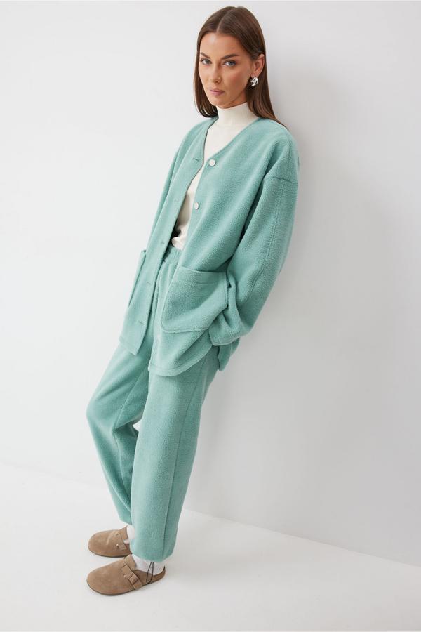 Описание Костюм, состоящий из жакета и брюк. Жакет прямого силуэта с фигурным низом из трикотажного полотна. Горловина округлая, по центру застежка на кнопки. Рукав со спущенной линией плеча. По переду накладные карманы. Жакет без подкладки. Обращаем ваше внимание, что фурнитура может отличаться от фото. Брюки прямого силуэта из комфортного трикотажного полотна. По верху брюк притачной пояс на резинке с декоративной нашивкой. На передних половинках обработаны карманы. Ширина брюк по низу регулируется за счет эластичной тесьмы и фиксаторов. Обращаем ваше внимание, что фурнитура может отличаться от фото.