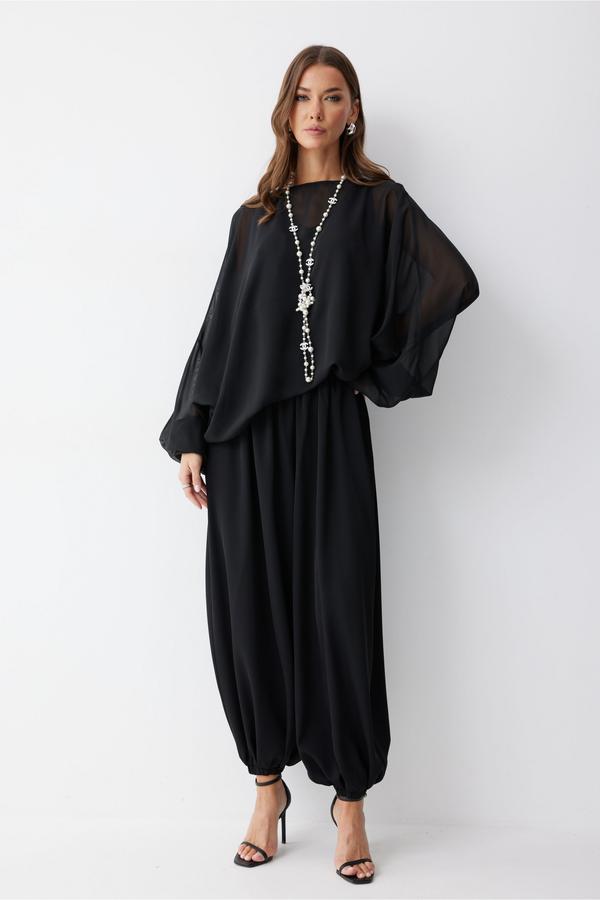 Описание Брюки шаровары свободного, расширенного силуэта, по низу со сборкой. Из струящейся ткани. Пояс с резинкой. По низу манжеты с резинкой.