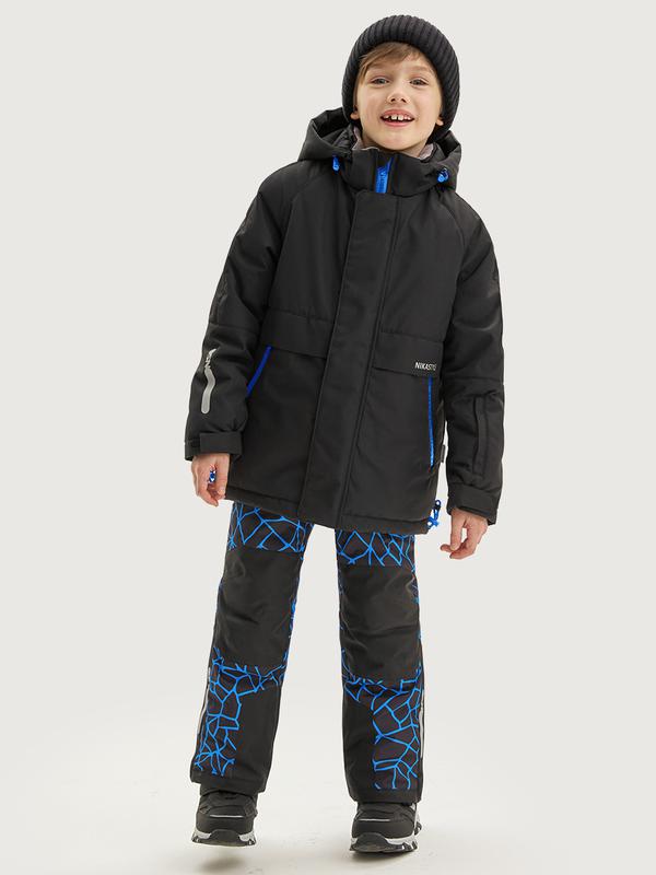 Сезон: ЗИМА. Пол: Мальчик. Категория товара: Костюмы (куртка и полукомбинезон). Цвет: черный/электрик. Мембранная одежда: Да. Ткань верха: МЕМБРАНА BREATEX Teflon 5000/5000 (100% полиэстер). Подкладка: флис + п/э (100% полиэстер). Температурный режим: от 0°С до -25°С. Утеплитель: fiberlite 250 (100% полиэстер). Мех опушки: без опушки