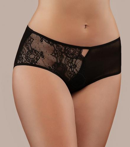 Передняя часть модели состоит из перекрещенных деталей эластичной сетки и кружева с открытыми фестонами. Задняя часть трусиков изготовлена из хлопкового эластичного полотна.