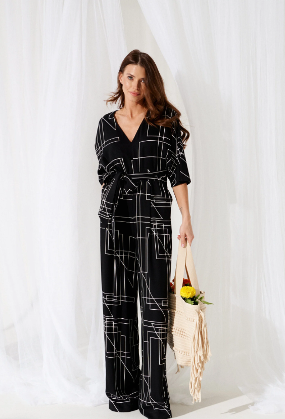 100% вискоза Комбинезон с центральной застежкой на потайную молнию в среднем шве спинки, с V-образным вырезом горловины. В боковых швах расположены карманы. Комбинезон отрезной по линии талии, шов по талии присборен на резинку. Вырез горловины спинки с завязками, расположенными ниже плечевого шва. Рукав 3/4.