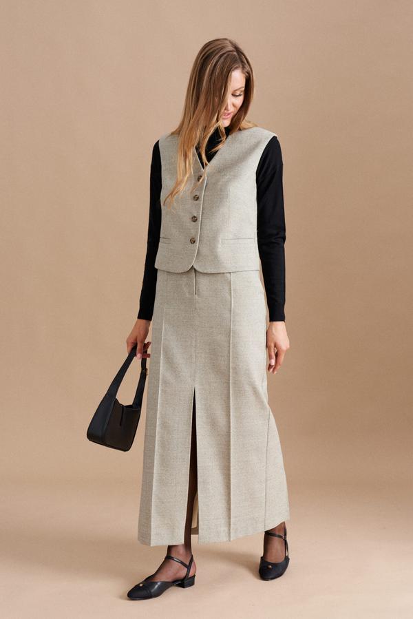 Юбка женская прямого силуэта на поясе. По переду функциональные карманы в боковых швах. В среднем шве юбки оформлен разрез от середины бедра до низа изделия. По спинке в среднем шве оформлен разрез, имитация прорезных карманов, вытачки. Длина изделия макси.