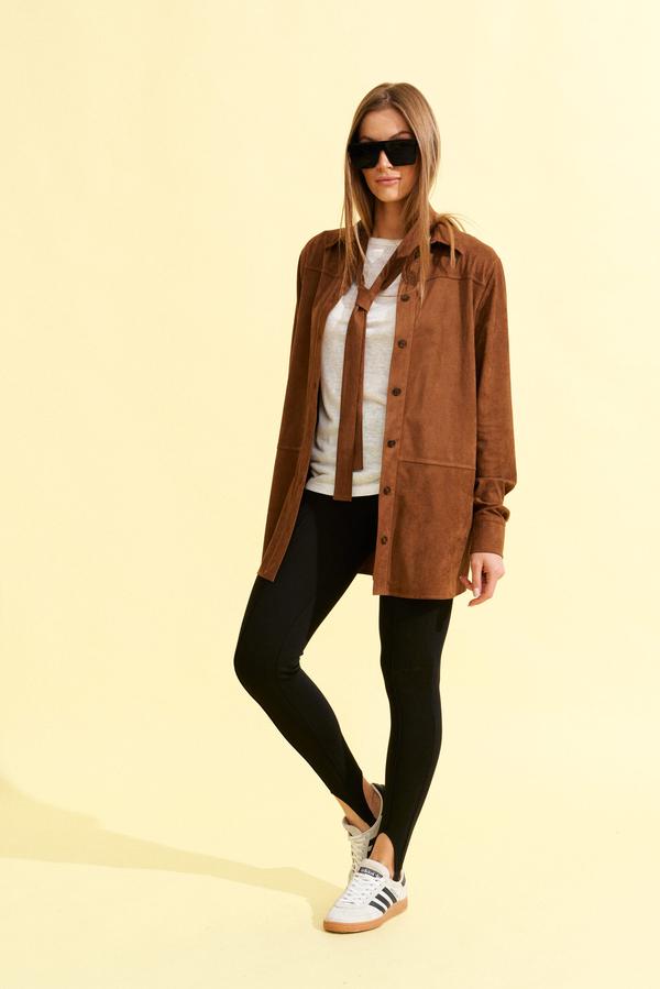 Блузка-рубашка женская из замшевого трикотажного полотна прямого силуэта с втачным рукавом и центральной застежкой на петли и пуговицы, длиной ниже линии бедер, со съемным поясом. Полочки с отрезной кокеткой, горизонтальным подрезом ниже линии талии и отрезными планками. Спинка с кокеткой и горизонтальным подрезом ниже линии талии, по боковым швам внизу разрезы. Рукав втачной двухшовный на притачной манжете. Воротник рубашечный отложной на притачной стойке