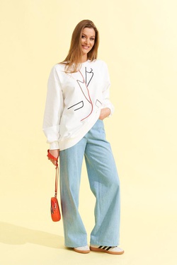 Брюки женские прямые широкие от бедра из джинсовой хлопковой ткани. Перед с рельефами от пояса до низа и полукруглым входом в карманы с отрезным бочком. На левом бочке маленький накладной карман(часы). По задним половинкам брюк талиевые вытачки, рельефы, аналогочно передним, и накладные карманы. Застежка на молнию с гульфиком и откоском в переднем шве. Пояс притачной со шлевками, застегивается на пробивную пуговицу(болт).