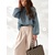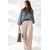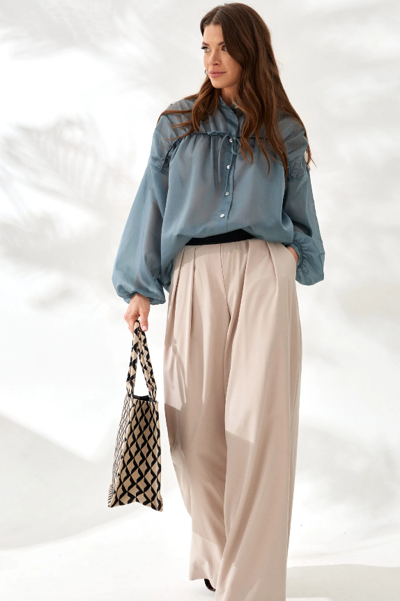 Блузка из воздушной вискозной ткани, прямая свободная со спущенным плечом, центральной застежкой на петли и пуговицы, длиной ниже линии бедер. По полочкам отрезные кокетки со сборкой по плечевому срезу и шву притачивая к полочке. По спинке также отрезная кокетка. В швах притачивания кокеток - кулисы со шнуром из основной ткани. Рукав одношовный широкий длинный, по низу на узкой резинке. Воротник стойка.