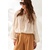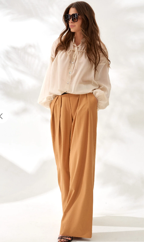Блузка из воздушной вискозной ткани, прямая свободная со спущенным плечом, центральной застежкой на петли и пуговицы, длиной ниже линии бедер. По полочкам отрезные кокетки со сборкой по плечевому срезу и шву притачивая к полочке. По спинке также отрезная кокетка. В швах притачивания кокеток - кулисы со шнуром из основной ткани. Рукав одношовный широкий длинный, по низу на узкой резинке. Воротник стойка.