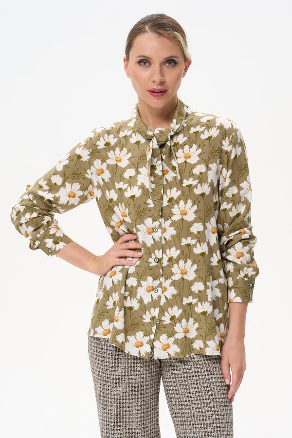 Класическая блузка из легчайшего штапеля. Длинные втачные ракава на притачной манжете, застегивающейся на пуговицу. Отложной воротник с имитацией галстука, спереди застежка на пуговицы. По низу боковых швов разрезы. Рост модели на фото 177.